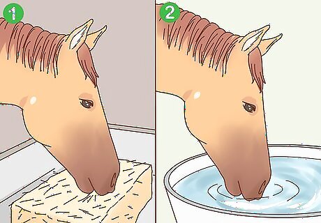 Feed and water your horse several hours before you set out. Before you attempt to load your horse into your truck or trailer, give it a hearty meal consisting of moist hay and clean, fresh water. A preliminary feeding is good for your horse’s digestion, and will help it retain more energy while standing in one place for long periods of time. If your horse is reluctant to eat, try offering it a wet mash flavored with fresh fruits, vegetables, or molasses. Feed your horse early and allow it to eat at a comfortable pace. Forcing it to eat and drink at the last minute could cause undue stress, which will make the rest of the process much more difficult for both of you.