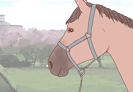 Fit your horse with a halter and lead rope. Slip the halter over your horse’s muzzle and around the top of its head just behind its ears. Cinch each of the buckle straps down until they’re snug, but not too tight. Then, tie or connect your lead rope to the bottom of the halter. Use a breakaway halter so you horse won’t accidentally hurt itself if it begins to struggle at any point. You’ll be using the halter and lead rope to control your horse as you lead it into your transport vehicle.