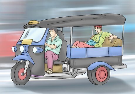 Hail a tuk-tuk or taxi when traveling locally. You will see tuk-tuks everywhere in Thailand; they are the famous 3-wheeled vehicles you have certainly seen in photos of Southeast Asia. Traveling in the open air tuk-tuk is a unique way to explore cities and larger towns, and something you’ll want to try at least once during your time in Thailand. Be sure to agree on a price beforehand. Choose a tuk-tuk during the day to see the sites, and use a taxi in the evening. Make sure your taxi is using a meter. A common scam in Thailand is un-metered taxis. You can also use ride sharing apps in all major cities of Thailand if you're afraid of getting scammed. Rates are typically cheaper or on par with the lowest rates that local taxis will offer, but beware of increased rates during peak hours. Beware of tuk-tuk and taxi scams that try to change your destination. Drivers can get a commission to bring tourists to certain places. If your driver says your destination is closed or unavailable, get a second opinion and avoid their suggestion for alternatives.