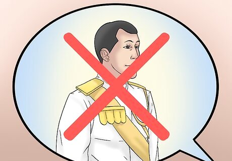 Respect the customs and culture of the Thai people. Like all countries, Thailand has its own set of customs and manners. Don’t discuss the King or royal family when in Thailand. Disrespecting the Thai monarchy is illegal for Thai people and foreigners alike. Avoid the topic altogether to be safe. Cover your shoulders, chest, and knees before entering a temple. Feet are thought to be the least clean part of your body. Avoid pointing your feet at anyone or crossing your legs. The head is considered a sacred part of the body in Thailand, so take care not to touch anyone’s head.