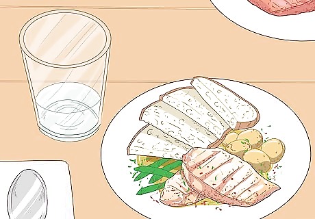 Eat small amounts of bland food several times a day. Bland foods include broth, white bread, and lean meats, such as chicken breast or white fish. Instead of having 3 large meals, eat small amounts of food throughout the day. Additionally, take small sips of water periodically instead of drinking a whole glass at a time. Follow the specific postoperative diet recommended by your healthcare provider.