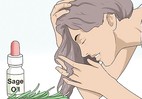 Use rosemary and sage oil. These two oils, when applied to the scalp, are believed to treat skin infections and promote hair growth. They are also thought to reduce inflammation and provide hair follicles with the proper nourishment they need. However, there are no clinical studies demonstrating either herbs ability to promote hair growth. Use 3-4 drops of each oil once a day or follow the manufacturer’s guidelines when applying. Rosemary may also prevent hair from going grey.