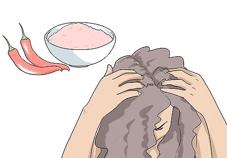 Eat chili peppers or rub then on your scalp. Capsaicin, the active ingredient in chili peppers, has anti-inflammatory and antioxidant properties that can increase blood flow, which is essential to maintaining a healthy scalp. Try cooking recipes with lots of chili pepper or, if you are feeling bold, try rubbing chili oil on your scalp but, be warned, it may burn. In order to avoid any complications, talk to your doctor before applying chili oil to your skin.