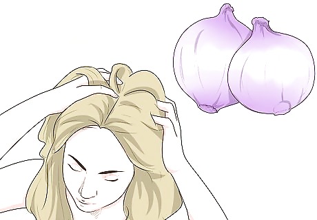 Rub onions on your head. Raw onion or onion juice, when applied directly to the scalp, has been shown to increase hair growth in those suffering from baldness. Simply dice or puree an onion and rub it on your scalp. Be sure to apply the juice to your scalp before you take a shower, otherwise you might smell strongly of onion all day.
