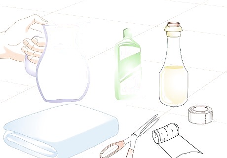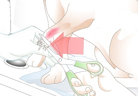 Gather supplies. You will need some medical supplies to treat your dog's wound. Items needed include: Warm water: placing a small dog in a sink or a large dog in the bathtub works great for this, plus it makes cleanup easy. Scissors or clippers (do not use electric clippers around water though). Clean, dry towels. Antiseptic cleaner. Optional supplies: Triple antibiotic ointment, water-based lubricant (for protecting the wound from hair while clipping), and a muzzle (if your dog bites).