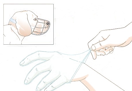 Protect yourself. Put on gloves to protect your hands. Also, if you think your dog may bite you, put a muzzle on him. If you don’t own one, a simple one can be made by using a three foot length of gauze. Make a loop near the center. Place the loop over the muzzle and around the mouth. Tighten the loop and loop the two free ends behind the ears and tie in a snug bow tie.
