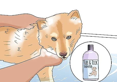Kill the fleas on your pets so they don’t spread to your yard. Use a medicated shampoo to kill and wash off the fleas and apply flea medication to keep them from living on your furry friends and moving back into your yard. Follow the recommended dosage for your pet’s flea medication. If your yard has fleas, then any pets you have are likely to have them as well, and they can spread them to your yard when they’re outside.Tip: If you use a flea collar, make sure the collar is secured tightly to your pet so when a flea passes over it, it’s exposed to the insecticide and dies.