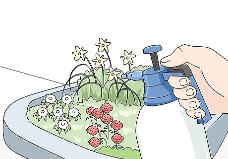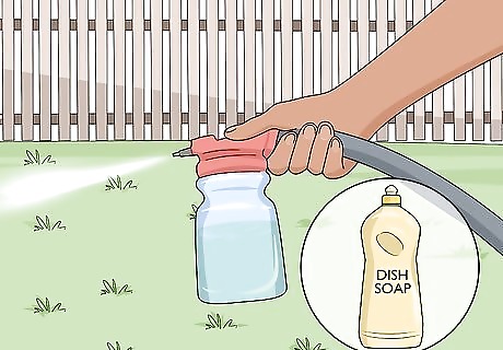 Spray your yard with dish soap to kill the adult fleas. Put 2 fluid ounces (59 mL) of dish soap into a 32 fl oz (0.95 L) hose sprayer and fill the rest up with water. Spray your entire yard and refill the sprayer whenever it runs out. Apply the solution once or twice a week to kill adult fleas. Repeat the process for up to 6 weeks to kill any larvae or eggs that hatch. Dish soap is safe to use on grass and most plants but can be harmful for succulents. If you do spray areas with succulent plants, rinse the plants off with clean water after you spray.