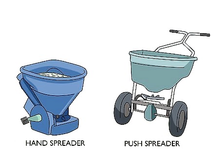 Use a hand or push spreader to apply flea pesticide granules to your yard. Load your spreader with insecticide granules and walk the length of your yard, applying them evenly over the entire surface. Apply the granules at a ratio of 1 pound (0.45 kg) per 1,400 square feet (130 m) of yard space. Work in sections so you don’t miss any spots. You can find hand and push spreaders as well as pesticide granules at home improvement stores, department stores, and online. Many flea pesticides are formulated to kill fleas, ticks, and ants.