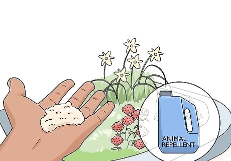 Set up deterrents to keep wild animals out of your yard. Fence in your yard and use animal repellants so critters such as possums, raccoons, and mice won’t come into it and spread fleas. Stack firewood neatly in a dry location so mice and rats won’t hide or live in them. Set up motion-activated lights to scare away wild animals that enter your yard. Be sure to clean up any garbage or food that could potentially attract flea-carrying animals as well. Use repellant granules to keep animals out of your yard.