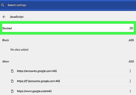 Click JavaScript. You should now see a blue switch Android 7 Switch On under “JavaScript,” and the word “Allowed.”