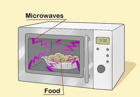 Learn what items use microwaves. Certain objects use this kind of radiation, but not very many (at least not as many as radio waves). Microwave energy is produced with klystron and magnetron tubes, and with solid state diodes such as Gunn and IMPATT devices. Microwaves use microwaves to heat up food. They are actually absorbed by the water, sugar, and fat in the food, and that is why they heat up. The plate stays cool since it doesn't have any water or fat. The power level varies on the energy of the microwave.