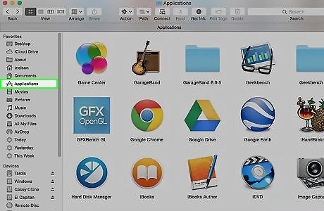 Open the Applications folder on your Mac. You can find the Applications folder on the Dock or the left sidebar in any Finder window. If you don't see the sidebar, click the View tab on the menu bar at the top, and select Show Sidebar.