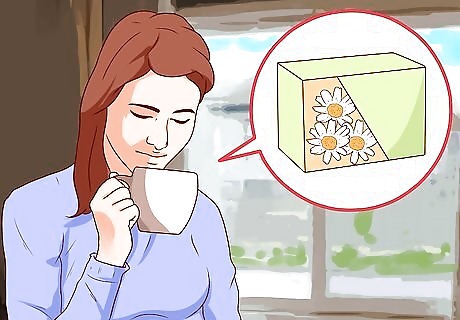 Enjoy a hot cup of herbal tea. Sipping a hot cup of herbal tea can be a good way to unwind, both for its relaxing herbal properties and the routine of enjoying a warm beverage. An hour or so before bedtime, bring fresh cold water to a rolling boil. Pour the hot water over your herbal tea bag, and allow it to steep for 5-10 minutes. Passionflower and chamomile teas have relaxation properties. Valerian root tea helps the symptoms of anxiety. You may still have worried thoughts, but the valerian tea may help calm the physical symptoms of anxiety such as tense muscles or rapid breathing. Be careful to avoid any caffeine before bedtime, which could interfere with your rest. If your tea is clearly labeled as “herbal” it’s unlikely to contain caffeine.