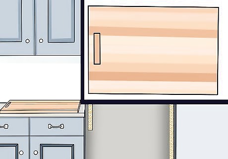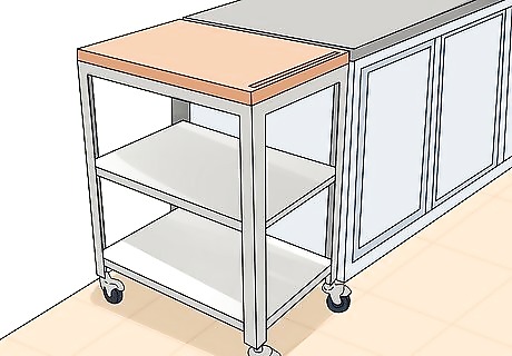 Extend counter space with an adaptable chopping board or cart. No matter how good of a cook you are, limited counter space can seriously cramp your style. Fortunately, you’re not stuck with the measly counters you were given. Buy an elevated chopping board that covers the stovetop so that you can utilize more flat space, install a folding shelf on the wall, or use a rolling cart as a portable kitchen island. Also think about how you’re possibly under-utilizing the countertops you already have. Appliances like toasters, slow cookers, and coffee makers can take up a lot of room, so consider storing them in a cabinet when you’re not using them.