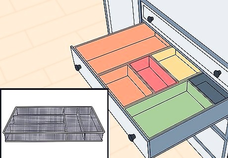 Maximize storage space with cabinet organizers and shelves. Even if you have rows and rows of cabinets, you're probably not making the most out of these spaces. By installing some in-cabinet wire shelves that compartmentalize cabinet space, you can organize your canned goods, spices, and dishes more efficiently while removing unsightly clutter. Drawer space can be maximized with plastic or metal drawer organizer inserts. You can also slip an over-the-door pantry rack on the inside of the pantry door, or use a rolling cart to store items when you're not using them. If you’re screwing or nailing any shelving into place, you might want to ask your landlord ahead of time. They might not mind if you leave the shelving behind when you move out, or they might want you to uninstall them before leaving.