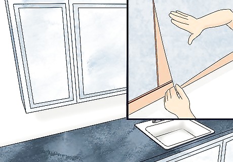 Change up your backsplash. The backsplash can be one of the more eye-catching aspects of the kitchen, but it also keeps oil splatter, drips, and cooking messes from staining the wall. Give your rental kitchen an easy upgrade by mounting a new, removable backsplash on the wall between your cabinets and counters. You can use temporary wallpaper or fabric and cover it with clear plastic sealant to make it easily cleanable, or you can use ceiling tiles and mount them on adhesive panels.
