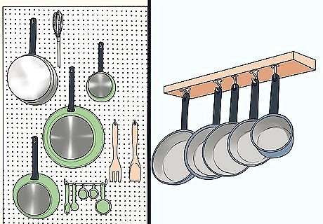 Hang pots and pans from the wall or ceiling. Even the most storage-conscious kitchen probably under-utilizes ceiling and wall space. You can free up tons of cabinet space while making your pots and pans more accessible and organized by installing a pegboard on the wall or a hanging pot rack on the ceiling. You can find a hanging pot rack for 50-100 dollars (46-93 euros) online or at a home improvement store, while a pegboard can cost you as little as 30 dollars (about 28 euros).