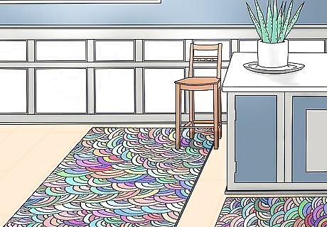 Spread colorful or printed rugs over unsightly linoleum. Unless your rental kitchen sports unusually lovely floor tiles, chances are that your floor isn’t the prettiest part of the room. Fortunately, it’s easy and affordable to cover up this eyesore with cotton rugs or outdoor mats. International household goods stores, such as IKEA, offer a wide variety of kitchen-ready rugs and mats.