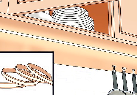 Mount under-cabinet lights for increased visibility. Dim lighting makes chopping, measuring, mixing, and baking—in short, everything you might possibly be doing in the kitchen—more difficult. Brighten up your countertops by installing some LED under-cabinet lights that you can switch on when cooking. Look for lamps that you can mount with heavy-duty adhesive strips for optimally easy dismantling when moving out of your rental.