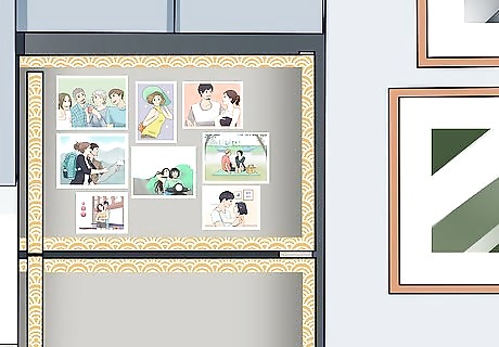 Plaster open refrigerator or wall space in photographs. Personal accents can be a great way to add flair and interest to your kitchen without altering it in a permanent or costly manner. Put a twist on the classic fridge magnet décor by spreading temporary, adhesive wallpaper over the refrigerator door or covering it in old photos. If you don’t have any Polaroids or photo prints handy, use a website service, such as Sticky 9, to make square print magnets out of your favorite Instagram pics.