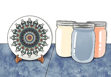 Put colorful dishes or mason jars on display. Decorating your kitchen doesn’t require a costly or permanent renovation. Instead, take some pretty wine glasses, platters, or vases from your cabinets and put them out on display, or buy some brightly colored mason jars and line them up in an eye-catching arrangement on a shelf or cabinet top. Clear or colored mason jars can be particularly striking if you showcase them against under- or over-cabinet lights.
