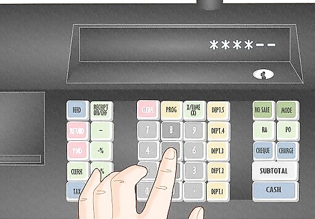 Enter a security code or password to use the register. Many registers will require that you enter a clerk number or other security code to use the register. Clerk numbers are useful so that each sale is attributed to a particular person. This is helpful in tracking sales and clearing up errors. If you work in a restaurant, you may need to enter your employee code along with the table number and number of customers. Newer cash registers (such as the Square cash register) may require that you log in with an email address and password.