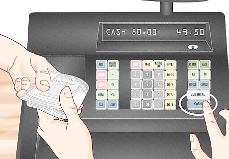 Determine how the customer is going to pay. Customers may pay in cash, with a credit card, or with a check. You may also accept gift cards or certificates, which are most often treated as cash. Cash: Type in amount of cash they give you and press CASH/AMT TND button (this is usually the largest wide button on the bottom right hand portion of the register's set of keys). Many registers will tell you how much change to give the customer. Some do not, however, and you will have to do the math in your head. Once the till drawer pops open, you can place the cash or check in the drawer and count out any necessary change. Credit card: Press CREDIT button (sometimes CR) and use credit card machine to run the credit card. Check: Key in the exact amount of the check, press the CK or CHECK button, and put the check in the drawer. To open the till drawer if you have not made a sale, you can press the NO SALE or NS button. This function may be protected for manager use only and may require that a manager uses a key to put the register in a different mode to access the NO SALE function.