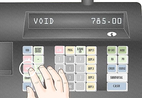 Void a sale. If you have mistakenly entered in the wrong price for an item, or a customer decides they do not want to purchase an item after you entered it in, you may need to void the item or sale. This will remove it from the subtotal. Type in an amount, press department key, press VOID (sometimes VD) button to remove it from the total. You must void an item before entering in a new item. Otherwise, you will need to subtotal the items, then press VOID, then press the exact amount you'd entered by mistake, and press the department key. This will subtract the incorrect amount from the subtotal. If you need to void the entire sale with multiple items, go through each item and void each one.