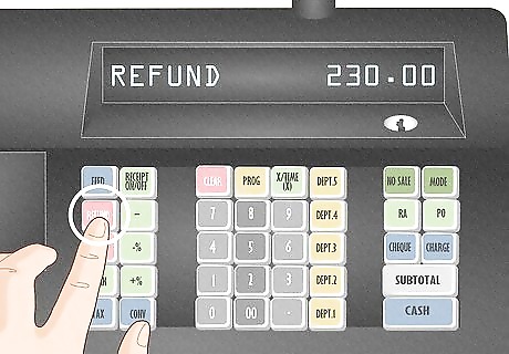 Refund a sale. If a customer wants to return an item, you need to account for that in the day's cash totals before handing back money to the customer. To refund a sale, press the REF key, type in the exact amount of the item, and press the corresponding department key. Hit the subtotal button and then hit the CASH/AMT TND button. The till drawer will open and you can issue a refund to the customer. Certain buttons and functions such as refunding money can be protected for manager use only. These might require that a manager uses a key to put the register in a different mode to use void or refund. Check with your supervisor regarding the correct policy for handling returns and refunds.