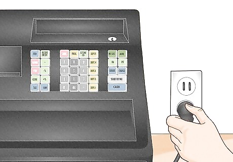Set up your cash register and plug it in. Find a hard, flat surface to set your register on. Ideally, this will be on a countertop with room for customers to place their merchandise. Plug the register directly into an outlet (do not use an extension cord).