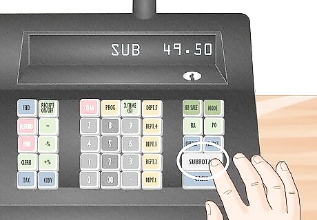 Hit the subtotal button. This button will give the total of the merchandise rung up. It will add any necessary tax that has been pre-programmed into the department buttons.