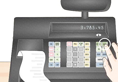 Hit the corresponding department button. Most registers require that you hit a button after the amount that assigns that item to a category of sale (for instance, clothing, food, etc.). Department keys can be programmed to be taxable or nontaxable. Consult your machine's manual for instructions on programming tax rates to correspond with keys. Looking at the receipt: press arrow or FEED key to have the register feed the receipt upwards so you can read what totals are being recorded on the receipt. Every item you add on will be added to a running total, which is usually displayed on the cash register reader or screen.