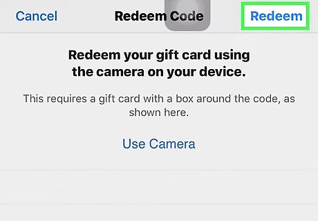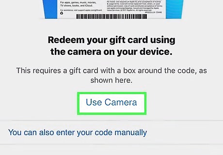 Tap Use Camera. It's near the middle of the screen. This opens your camera screen, which allows you to quickly capture the redemption code without typing it. In most regions, you should be able to scan the code with your iPhone or iPad's camera as long as there's a black box surrounding the 16-digit redemption code. If you can't use your camera to scan the card, tap You can also enter your code manually, and then type the 16-digit code (including the X) into the blank.