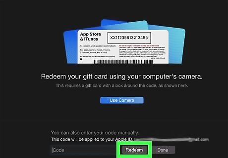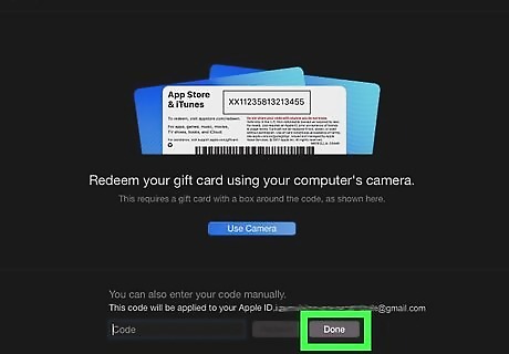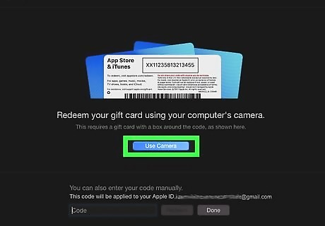 Click Use Camera. This option will open your Mac's camera (if you have one), which allows you to scan your gift card. You should be able to use your Mac's web camera to scan your card as long as there's a black box surrounding the 16-digit redemption code. If you don't have a web camera, don't see a black box around the code, or are in region that doesn't support the option, click You can also enter your code manually, and then follow the on-screen instructions to enter the code.