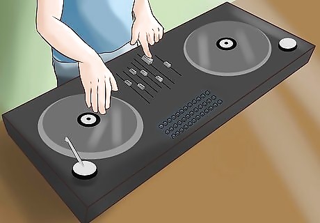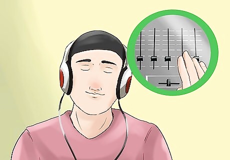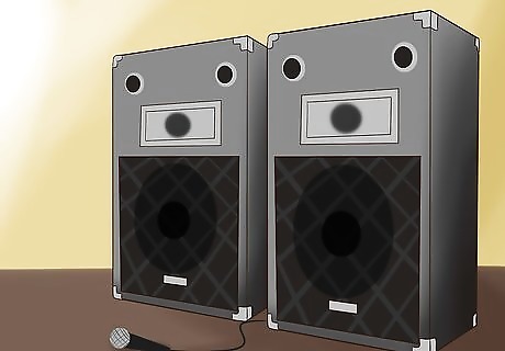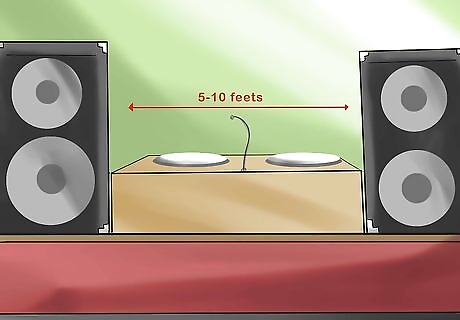 Take your loud speakers and set them up about five to ten feet to the right and left of your DJ booth, the should be angled towards the audience and be at the height of their ears. This is imperative.