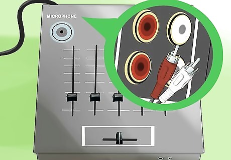 To plug in your turntable set into your mixer, use RCA (those red and white tipped cords) cables or XLR (microphone) cables (depending on the turntables, they will vary). MAKE SURE YOU ARE ALWAYS PLUGGING FROM OUTPUT TO INPUT (and vice versa)! Plug this into your mixing board, into either the tape inputs (those RCA cords) or the XLR into a microphone channel.