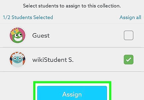 Assign the collection to your students. When you create a collection, it'll be saved to your library. You can assign any collection in your library to your students. Here's how: Tap the heart icon on the navigation bar. This opens your library. Tap Collections. Tap Assign on the collection you want to assign. A list of your students will appear. Tap Select All to assign this collection to the whole class, or tap individual student names if only some students should complete these activities. Tap Assign. Now that the collection is assigned, your students can log in on their tablets or computers to complete their assignments.