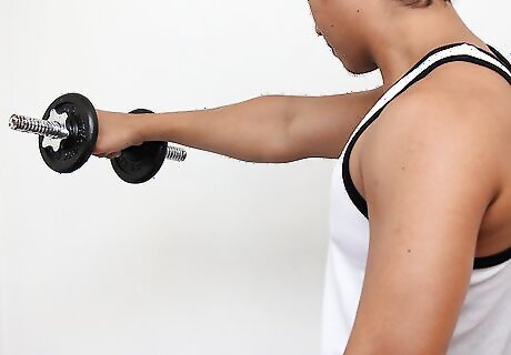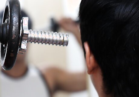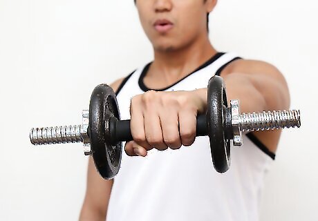 Progress slowly to heavier weights. Increase in increments of 1 to 2 lbs (0.4 to 0.9kg) after 3 sets of 10 no longer fatigues your muscles. The aim of weightlifting is to feel a "burn" during the last set of your exercises, so that you know your muscles are working hard to lift the weight. Although you should aim to fatigue your muscles during your hand weight exercises, you should never feel a loss of control. If you are unable to lift the weights for at least 2 sets while retaining proper form, move to a lighter weight.
