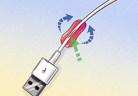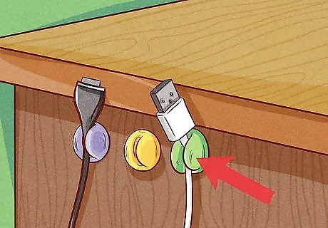 Place globs of Sugru on the side of your desk to make a cable organizer. Roll a piece of Sugru into a thick disc shape about ⁄2 inch (1.3 cm) thick and push it onto the side edge of a table or desk. Push a toothpick into the middle of the disc until it almost hits the back of the Sugru. Remove the toothpick and push the 2 top pieces of the Sugru toward each other without actually having them touch. Finally, leave your new cable clip alone for 24 hours to set. Repeat this process to create a series of cable clips along the side of your desk or table.