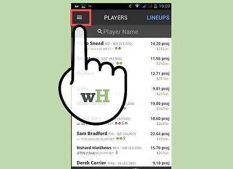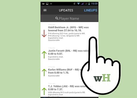Create a fantasy lineup for the contests you want to participate in. DraftKings offers up a list of players from upcoming games for you to pick. It also offers useful stats like Fantasy Points per Game (FPPG) and Opponent Ranking vs Position (OPPG) to help you identify potential picks for your draft. Select the league you want to create a lineup in, like the NFL for the nationals and the CFB for college football. Fill in the roles with the players you want. You’ll have to pick one quarterback (QB), two running backs (RB), three wide receivers (WR), one tight end (TE), one flexible position (FLEX) and one defense/special (DST). Remember to stay under the salary cap of $50,000. Make sure to review player stats to help you gauge if your choice is worth the money it will cost to import them into your fantasy football team. Do as much research as you can on your potential lineup. The DraftKings app provides some information, but knowing what you can about the picks in your draft – from recent injuries to the consistency of their performance throughout multiple games – will play a huge role in giving you the edge over your competitors. Submit your lineup when you’re ready.