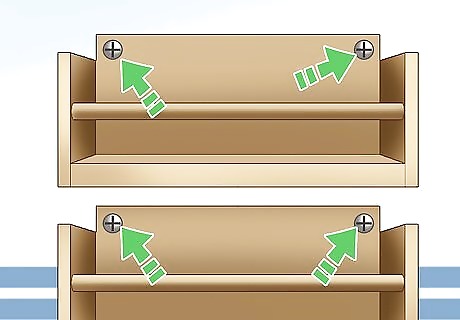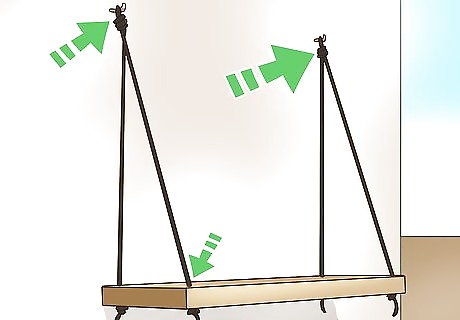 Make a hanging shelf with rope and a wooden plank. Buy a board that’s about ½ inch thick (1.3 cm) and two to three feet long. Drill one hole in each end of the wider part of the board. Feed a piece of rope through each hole, knotting it under the board. Screw hook screws into wall studs and tie the rope around the hooks. The shelf can be as long you want, but may require more rope and hooks for a longer shelf. Always use caution when using power tools.
