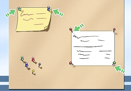 Hang cork boards around the house. Go to a craft store or any big-box store and buy some cork boards or cork panels. Nail them by the front door to leave messages, in the kitchen for receipts or reminders, or in the laundry room for the laundry schedule. Stick extra tacks in the cork for new additions. The benefit of cork boards is that it’s easy to take things down and pin new things up. They work great for collecting the various scraps of paper that always accumulate around the house.