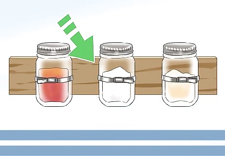 Make a mason jar display. Buy a ½ inch (1.3cm) wooden plank, some mason jars, screws, and circular pipe clamps. Use screws to attach the pipe clamps to the board. Slide the mason jars into the ring clamps and tighten the clamps. Hang the board on the wall over your counter. Use the jars to store utensils, spices, change, batteries, toothpicks or almost anything that fits in the jars. Be sure to screw the board into wall studs so it’s secure.