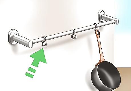 Hang towel bars with S-hooks for pans. Buy a basic towel bar and metal S-hooks at a hardware or big-box store. Follow the towel bar instructions to attach it to a kitchen wall with available space. Hang the S-hooks from the bar. Hang pots and pans from the S-hooks. The benefit here is that you’ll free up cabinet space and the cookware is easier to reach. It’s best to screw the towel bar into wall studs whenever possible. Since cookware weighs more than a towel, you’ll need the extra support.