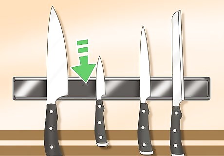 Switch from a knife block to a magnetic knife strip. Buy a sturdy magnetic knife strip from a department store or hardware store. Hang it on the wall over the counter where you are most likely to use the knives. The benefit of this is that by moving the knives to the wall, you free up the counter space that the knife block was using. It also saves a bit of time grabbing a knife from the wall rather than from the knife block.