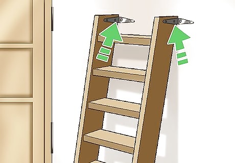 Lean a wooden ladder against the wall behind a door. Choose a ladder with plank steps as opposed to rungs. Push the ladder up to the wall, keeping it far enough away from the door for the door to open. Use two small L brackets screwed to the wall and the sides of the ladder to keep it in place. The planks of the ladder function as shelves. Use the ladder to store shoes, car keys, mail, or other things that pile up on flat surfaces. A different but related space saving solution is to hang your ladders from the ceiling when they're not in use.