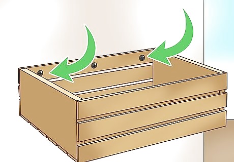 Attach wooden crates or wire baskets to the walls. Use old milk crates, wooden boxes, or wire baskets to add wall storage to any room. Hang them open side up like a regular container, or hang them open side out as a shelf. Secure the boxes to the wall by screwing them into studs or using curved wall hooks. This is a versatile option because it works with any type of basket, box, or crate. The material of the basket will determine what hanging method works best. For wooden crates, screwing them into studs is a good option. Wire baskets can be hung from hooks.