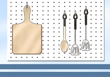 Install a pegboard for storing small utensils. Go to the hardware store and buy a rectangular piece of pegboard, as well as some hooks that are designed for pegboard use. Pegboards come in many sizes, so choose what suits your wall space best. Hang cooking utensils or other kitchen items for quick access. You’ll also need a minimum of four screws to secure the board to the wall at the corners.