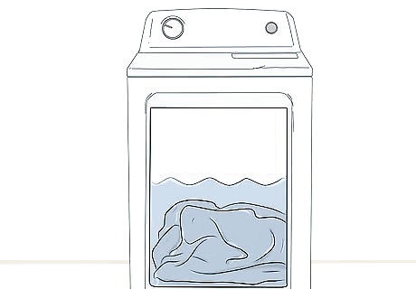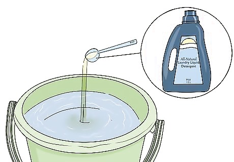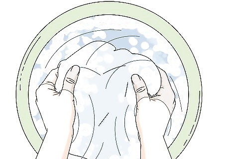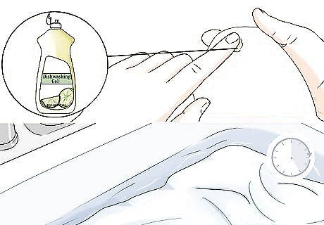 Add roughly 1 teaspoon (4.9 mL) of mild liquid detergent. Pour in the detergent, then stir the water gently by hand to mix it in. Taking a moment to dilute the detergent will ensure that it does its job without being any harder on your sheets than it needs to be. Be careful not to use too much detergent. Doing so is likely to damage your linens in the long run.